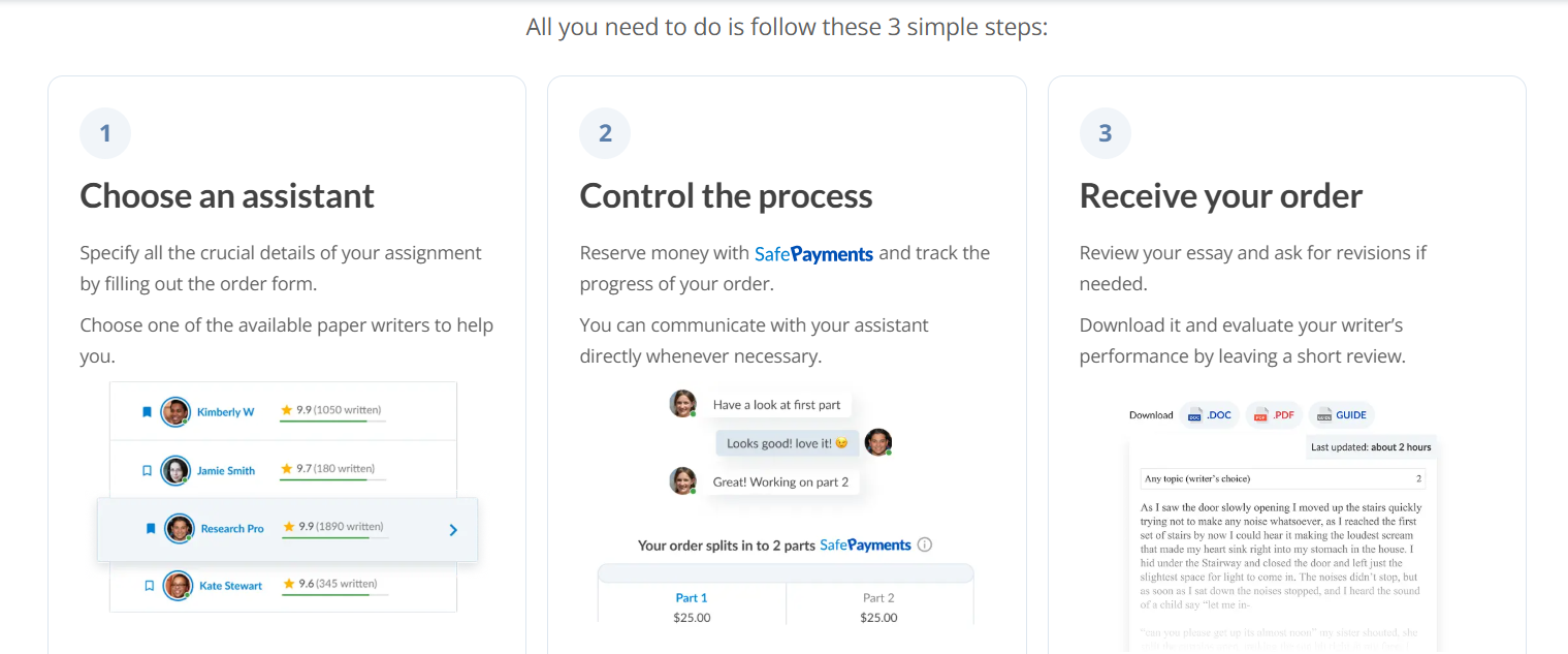 1. Providing order information: the initial step is filling out an order form, where you provide the writers with as many order details as possible. It helps the writers to understand what you are looking for.